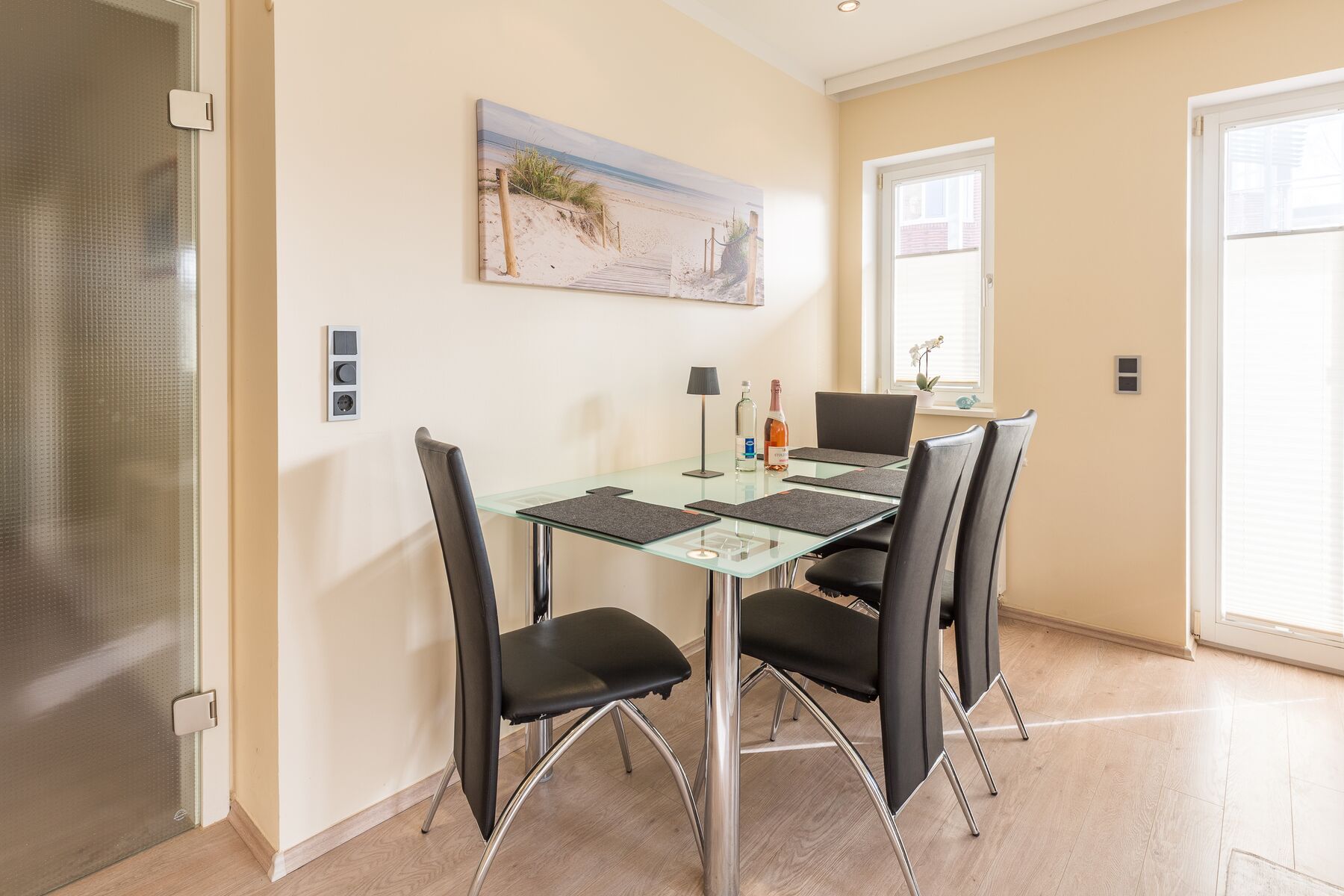 Die Ferienwohnung Nr. 1 in der Villa Wagenknecht liegt im Erdgeschoss zur Südseite und ist 47 m² groß. Sie ist modern und mit hochwertigen Möbeln ausgestattet und verfügt über eine komfortable Küchenzeile mit Geschirrspülmaschine und Mikrowelle sowie ein Bad mit Dusche und WC.